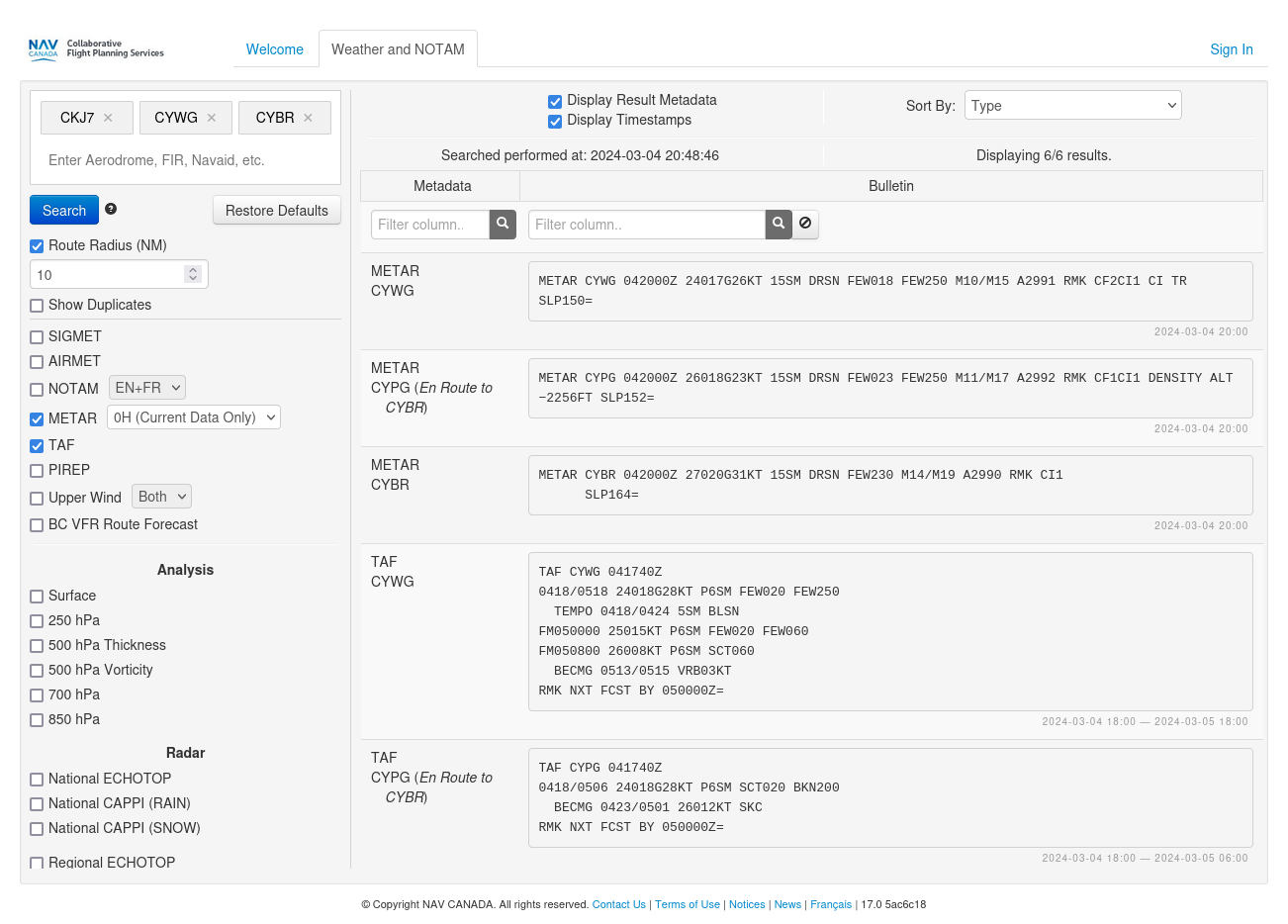 The NAV Canada Collaborative Flight Planning Services website is an online tool which offers services which can help you prepare for flight. This article will go over how to use the CFPS site to look at aviation weather in the form of TAFs, METARs and Graphical Area Forecasts. For information on how to use the CFPS site to look at NOTAMs visit this link.