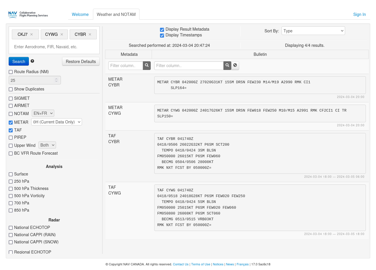 The NAV Canada Collaborative Flight Planning Services website is an online tool which offers services which can help you prepare for flight. This article will go over how to use the CFPS site to look at aviation weather in the form of TAFs, METARs and Graphical Area Forecasts. For information on how to use the CFPS site to look at NOTAMs visit this link.